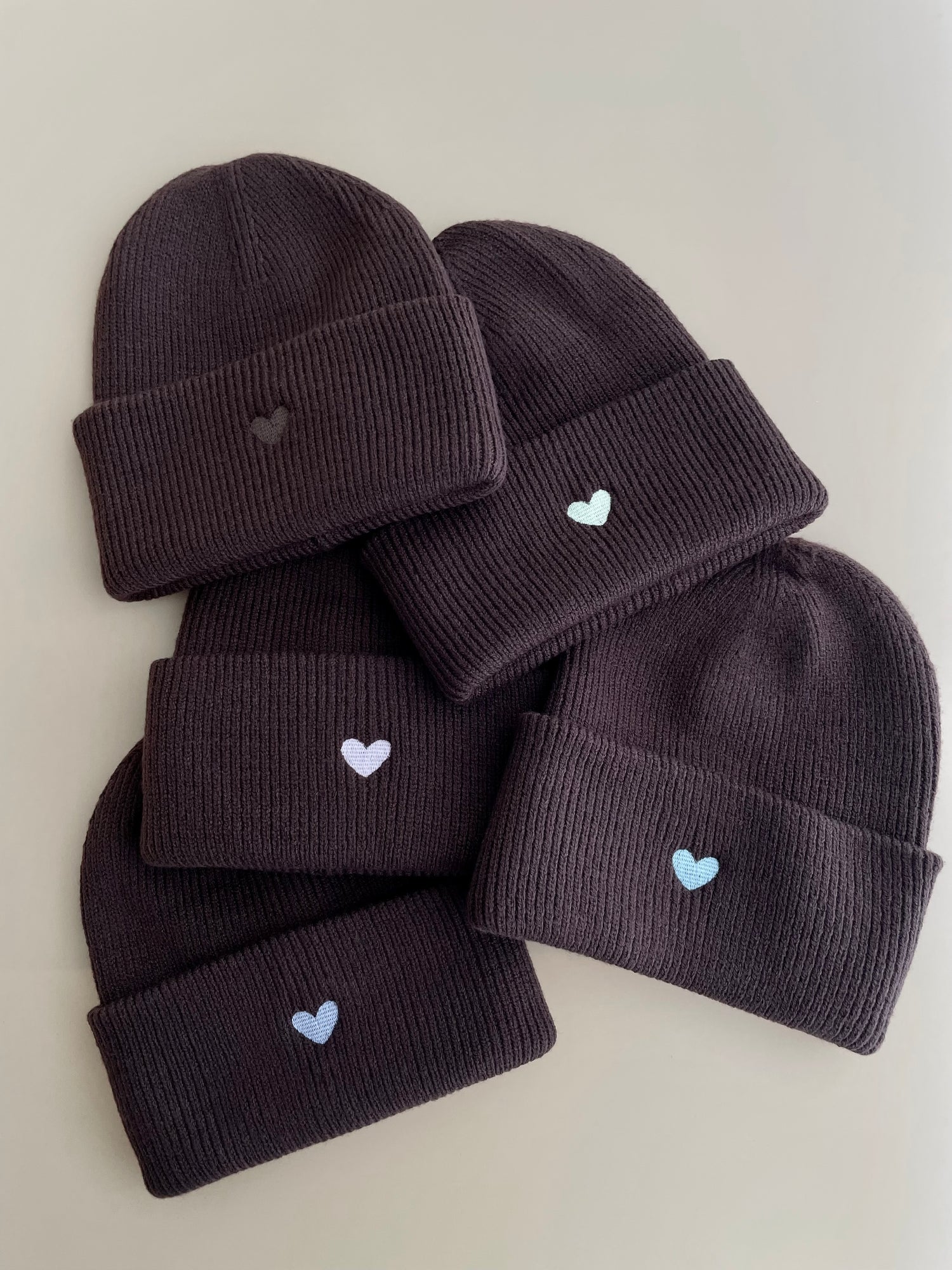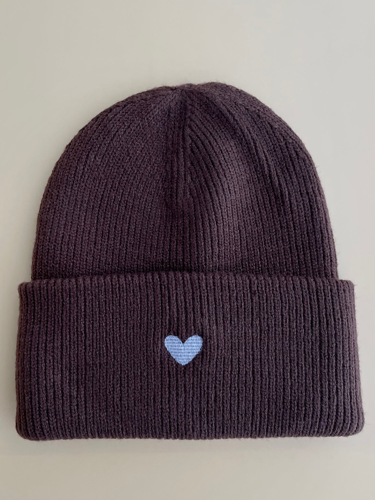 Das gestickte Herz befindet sich vorne auf dem breiten Umschlag der Mütze und ist ungefähr 2 cm groß.